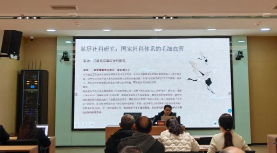 会上,巩主席首先总结分析了2025年度市、区两级立项课题推进情况,并部署下一阶段研究任务及结项要求。随后,中国科学院自然科学史研究所科技史博士、绵阳师范学院科学技术处副处长陈桂权副研究员,以《扎根基层、赋能实践:基础社科研究的方法论与生命力》为题作专题培训。陈桂权博士的培训围绕四大核心模块展开,内容兼具理论深度与实践指导性。陈博士在第一部分“破冰与定位”中提出基层社科研究并非“小众领域”,而是连接理论与现实的关键纽带,他鼓励研究者重新发掘基层场景中独特的研究价值,打破对社科研究“脱离实际”的刻板印象。陈博士针对基层研究者普遍面临的“从选题到落地”的困惑,在第二部分“研究方法论”中提出了从“问题”到“成果”的四步实操法。该方法聚焦基层实际需求,通过“精准选题-实地调研-系统分析-成果转化”的闭环流程,为研究者提供了可直接套用的操作框架,有效降低了基层社科研究的入门门槛。第三部分“案例分析与实践路径”环节中,陈博士又结合自身参与的基层社科项目实例,详细讲解了高质量研究的完整形成过程。从如何在日常工作中捕捉研究线索,到如何运用科学方法开展调研,再到如何将研究成果转化为服务地方发展的实际举措,层层递进的讲解让参会者对基层社科研究的实践逻辑有了清晰认知。最后,陈博士以“做一名有温度的地方基层社科工作者”作培训总结。他强调,基层社科研究既要坚守科学严谨的学术态度,更要怀揣对地方发展的责任感与对群众需求的同理心,让研究成果真正扎根基层、服务群众,彰显社科研究的现实生命力。整场培训内容翔实、案例鲜活,得到了参会人员的广泛好评。大家纷纷表示,培训内容直击基层社科研究的痛点难点,提供的方法论实用高效,为后续课题研究的推进和个人研究能力的提升提供了有力指导。