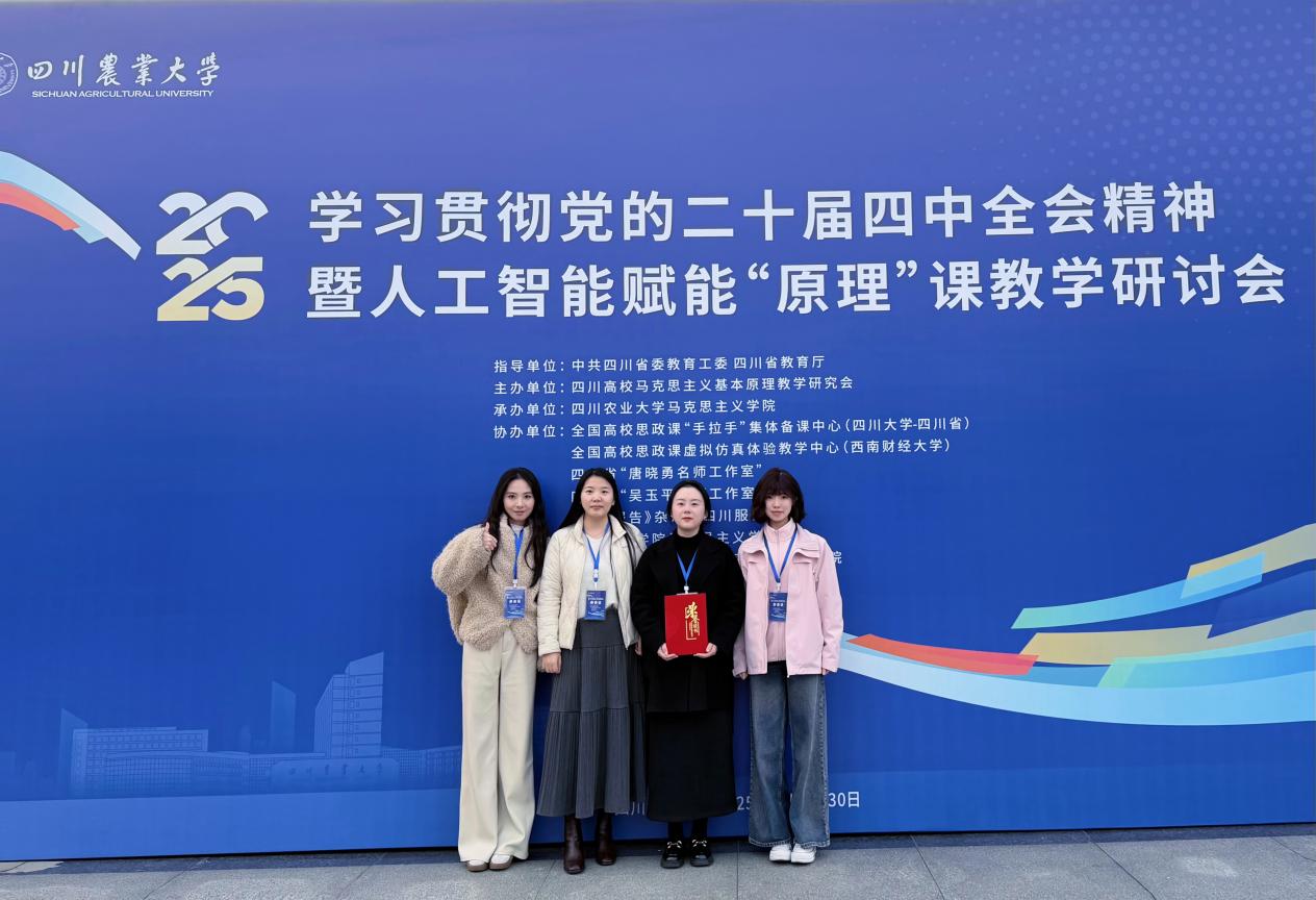 为深入探索人工智能赋能马克思主义基本原理课教学的新路径,切实提升我院原理课教学质量与育人实效。11月29日,我院教师刘萍、肖蔓莎、王娜娜、霍思颖参加“学习贯彻党的二十届四中全会精神暨人工智能赋能‘原理’课教学研讨会”。此次会议由四川高校马克思主义基本原理教学研究会主办、四川农业大学马克思主义学院承办,全国高校思政课“手拉手”集体备课中心等多家单位协办。