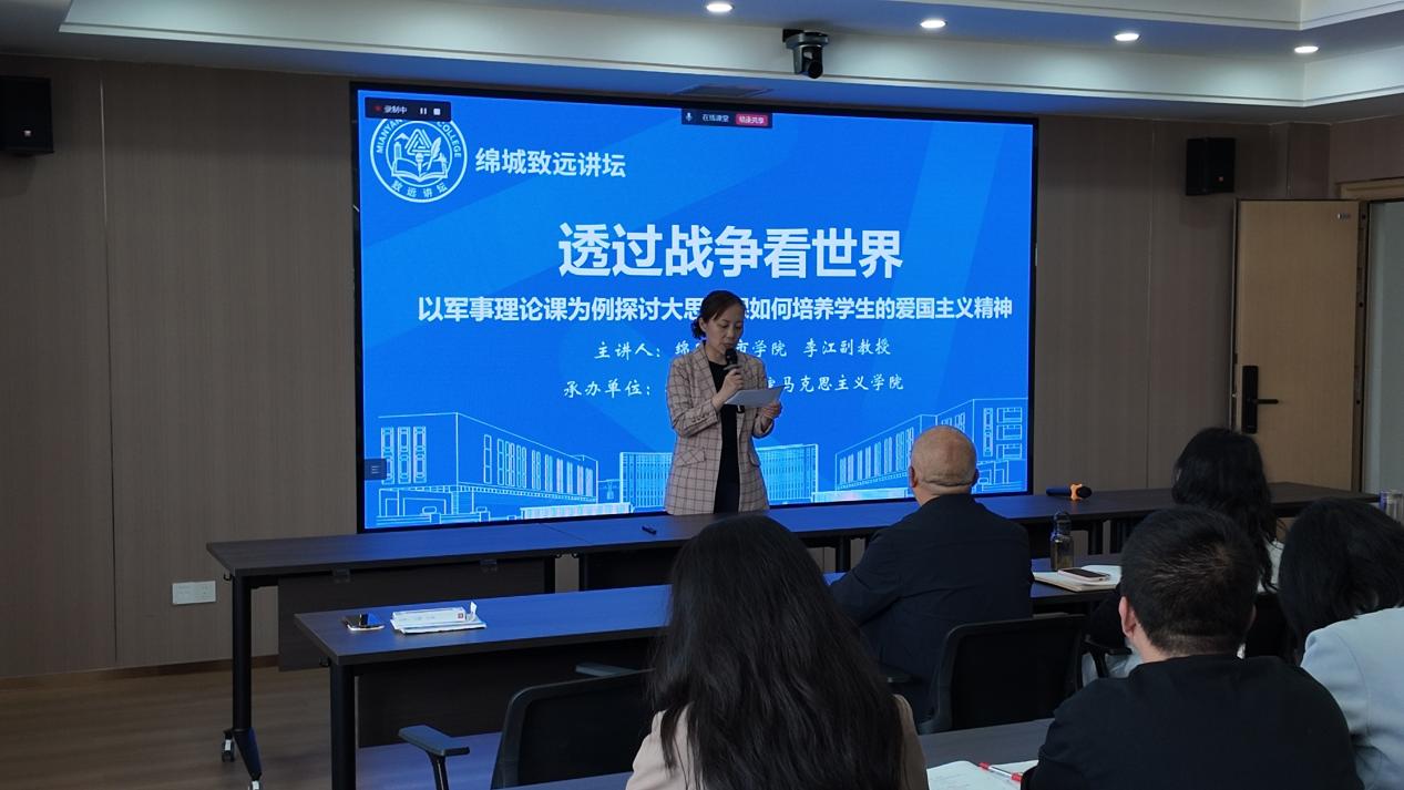 2026年4月17日,马克思主义学院在游仙校区综合楼第四会议室成功举办了第五期“绵城致远讲坛”。本次讲坛邀请绵阳城市学院李江副教授以《透过战争看世界——以军事理论课为例探讨大思政课如何培养学生的爱国主义精神》为主题,为全院老师搭建了思政育人交流平台,助力提升“大思政课”建设水平与育人实效。讲坛由教研办主任黄楠主持。