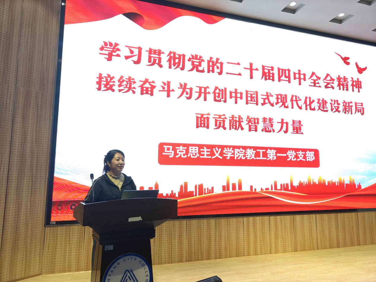 会议伊始,党支部书记张美艳领学了党的二十届四中全会精神,并作了主题发言。她强调,“十四五”期间,以习近平同志为核心的党中央带领全国人民迎难而上、锐意进取,取得了举世瞩目的重大成就。本次全会是在向第二个百年奋斗目标迈进的关键时刻召开的一次重要会议,明确了“十五五”时期经济社会发展的指导思想、重大原则、主要目标和重点任务。作为思政课教师,必须坚定拥护“两个确立”,坚决做到“两个维护”,深入学习领会全会精神,将其融入思政课教学,用党的创新理论武装学生头脑。