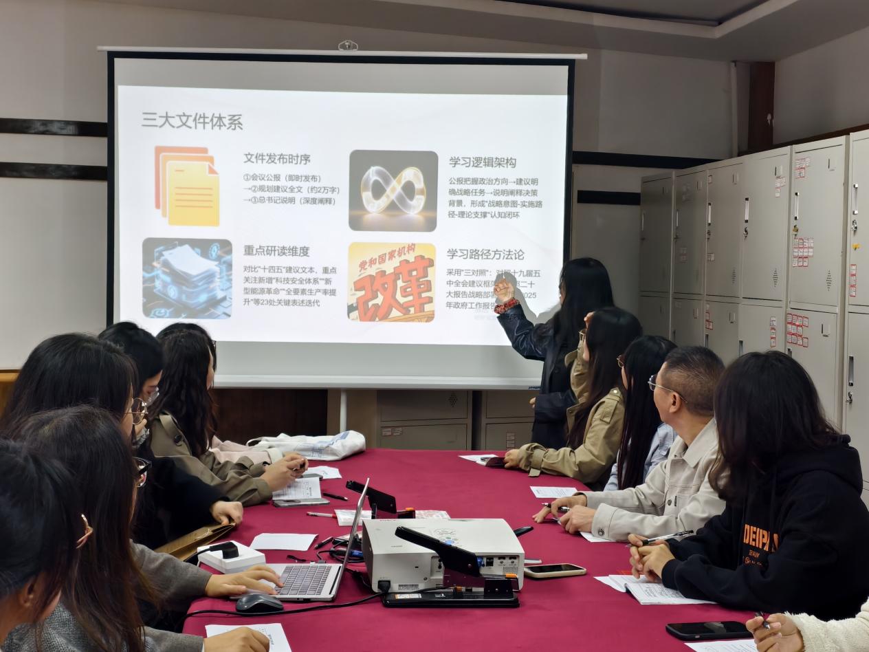 为深入学习领会党的二十届四中全会精神,2025年10月24日,马克思主义学院教工第三党支部于游仙校区博艺楼204会议室召开了专题学习会。会议认真学习了《中共中央关于制定国民经济和社会发展第十五个五年规划的建议》,并围绕如何将会议精神融入思政课教学展开了激烈的讨论。本次会议由党支部书记彭雅丽主持,全体党员参会。