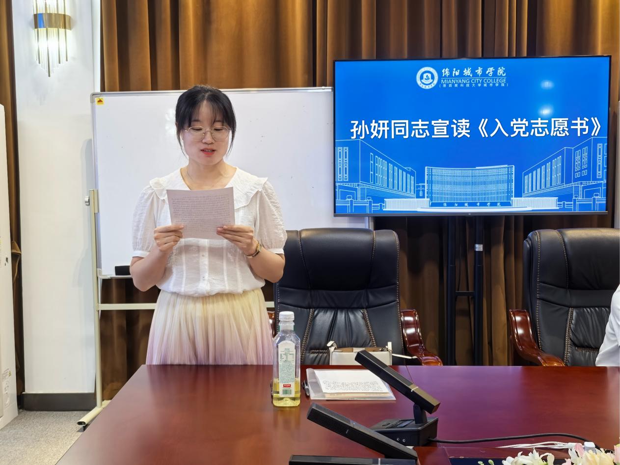 孙妍同志作表态发言时表示,将以此次入党为新的起点,始终以党员标准严格要求自己,不断加强理论学习,立足三尺讲台践行初心使命,在教学科研和立德树人工作中发挥先锋模范作用。