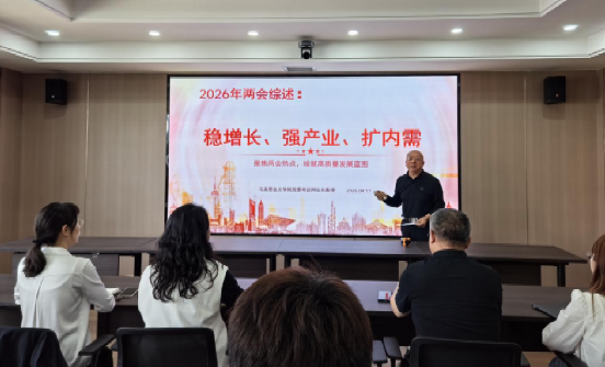 为深入学习领会2026年全国两会精神,深刻领会党和国家的重大决策部署,4月17日下午,马克思主义学院教工第一党支部召开理论学习会。学院党委书记何仕元同志以“聚焦‘稳增长、强产业、扩内需’--学习领会2026年全国两会精神”为主题,为党支部全体同志作专题辅导报告。